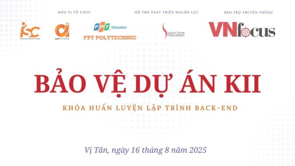 Vào lúc 8g30 ngày 16/08/2025 (thứ bảy) ISC cùng với các đối tác tổ chức buổi bảo vệ dự án, bế giảng Khóa huấn luyện lập trình Backend (K2) dành cho sinh viên FPT Politechnic Cần Thơ và tổ chức cho các doanh nghiệp đang hoạt động tại ISC phỏng vấn tuyển dụng tại toà nhà số 3, ISC, số 198 đường 19/8, phường Vị Tân, thành phố Cần Thơ.