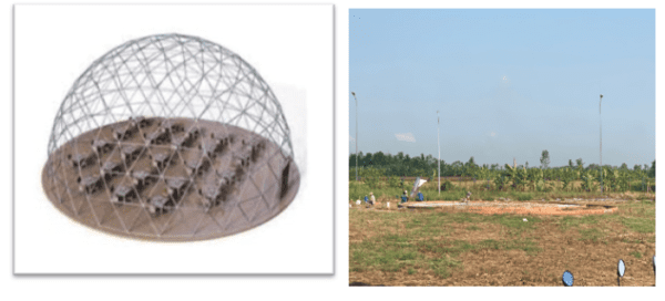 Mô hình nhà mái vòm số 1 và công trường đang triển khai xây dựng
